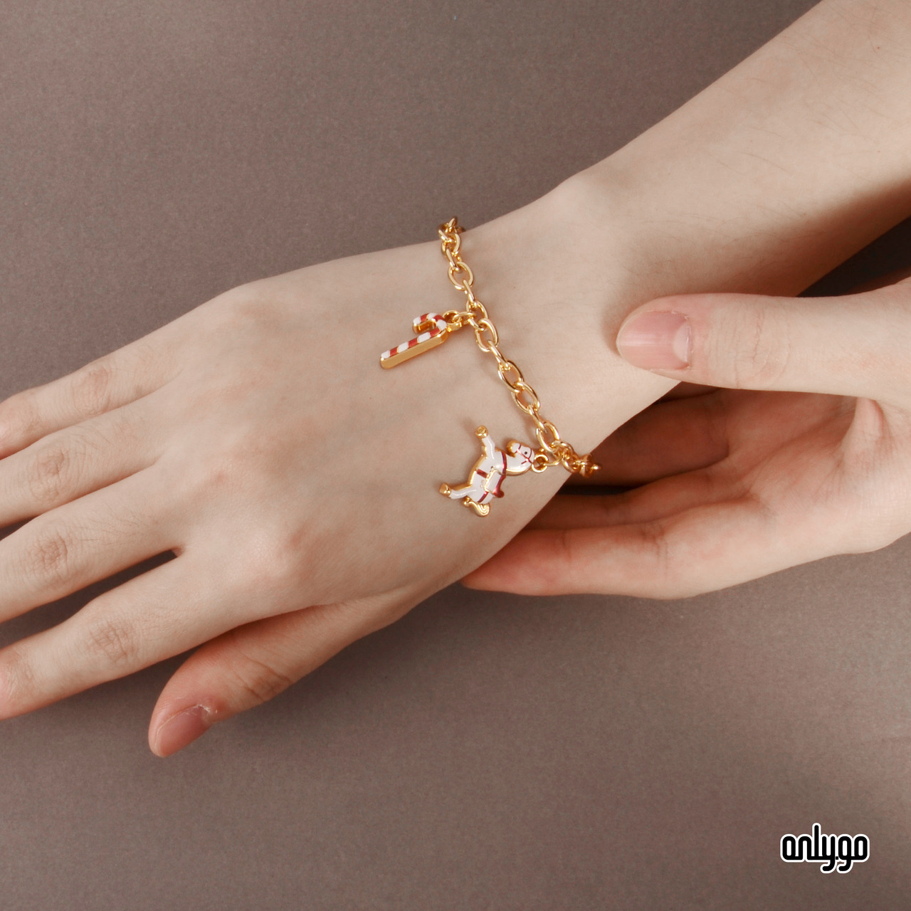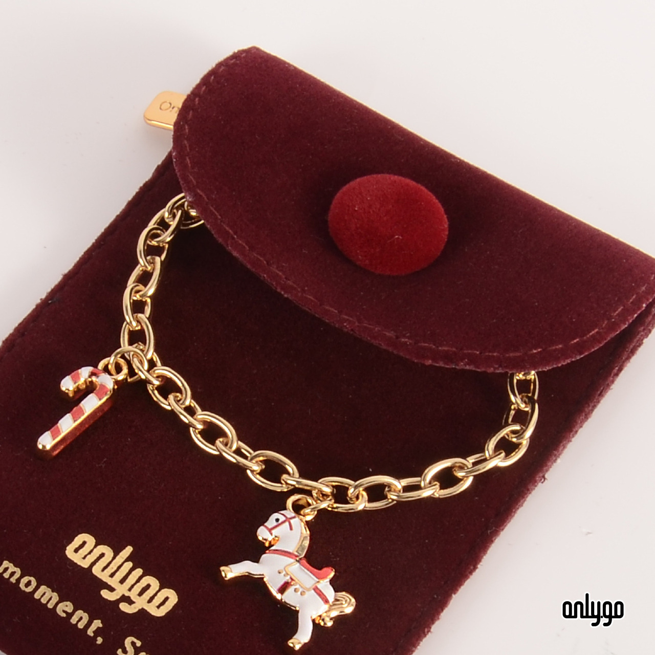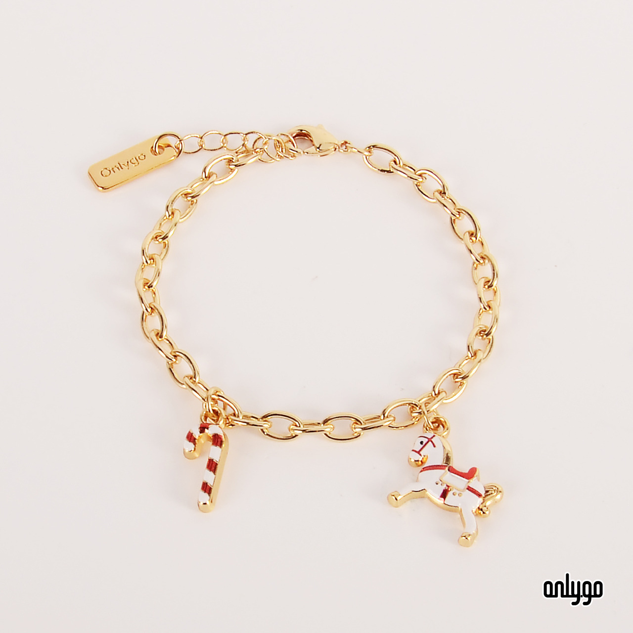 達拉木馬 Dala Horse 最早是松木原色,後來增加紅色、白色或是藍色。昂里設計師結合聖誕節白雪的氛圍,設計出白色木馬,再配上小孩都喜愛的枴杖糖,作為手鍊的吊飾。