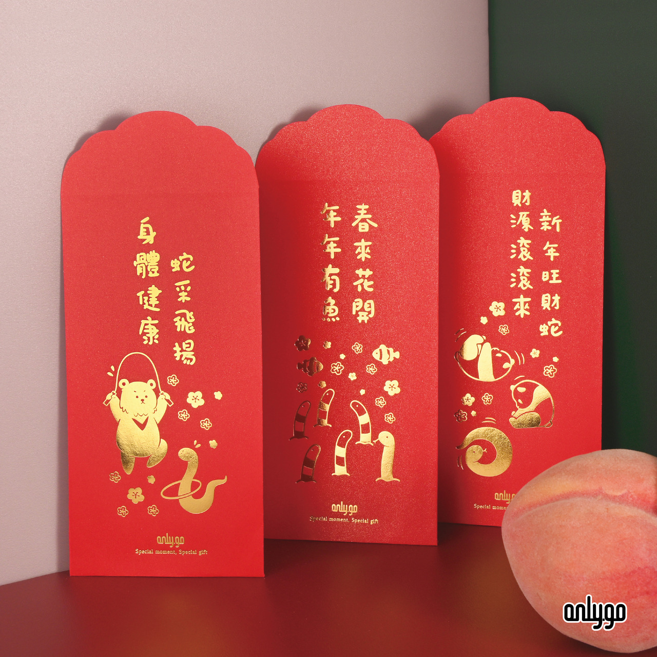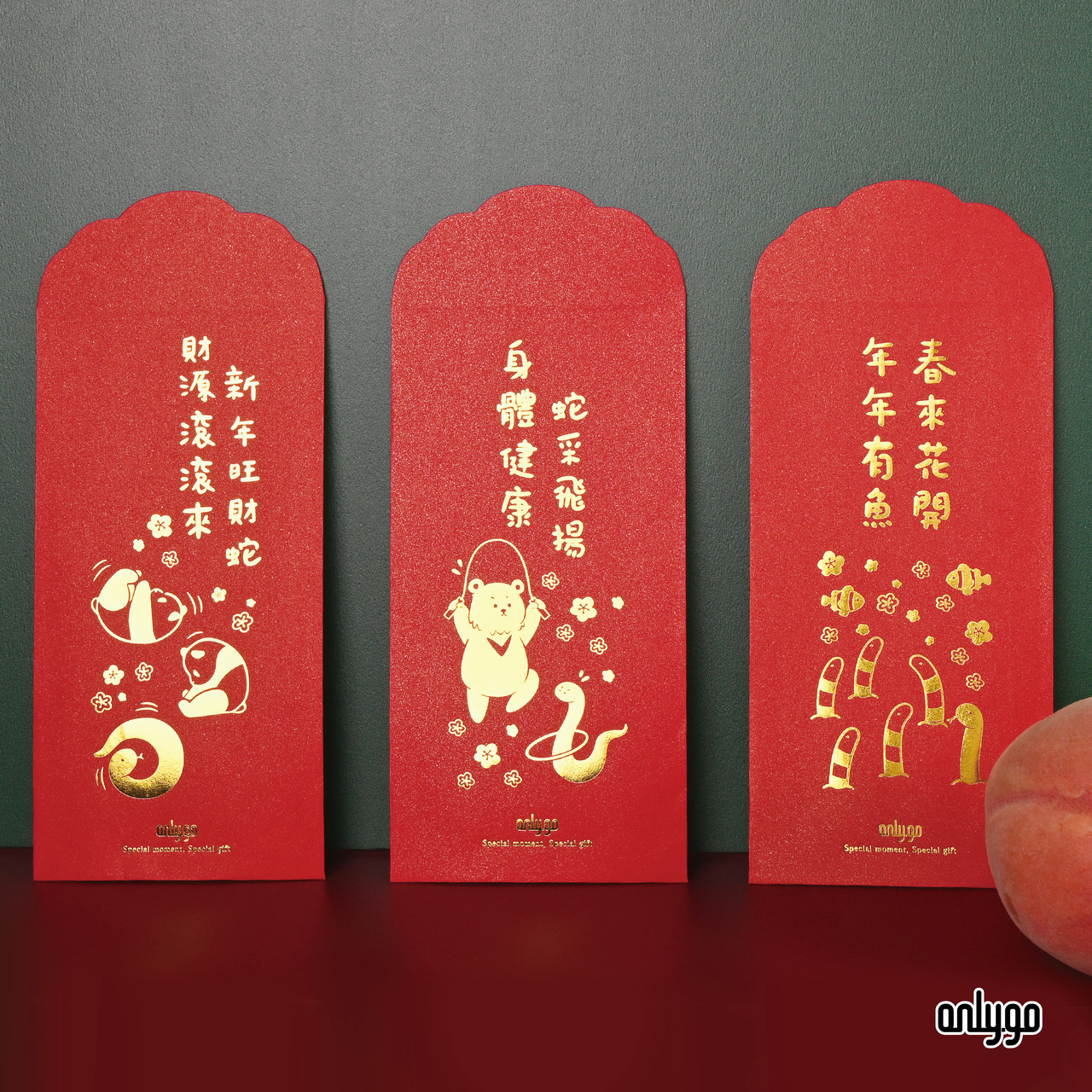 2025 蛇年燙金紅包袋每包三入,每個圖案各一。