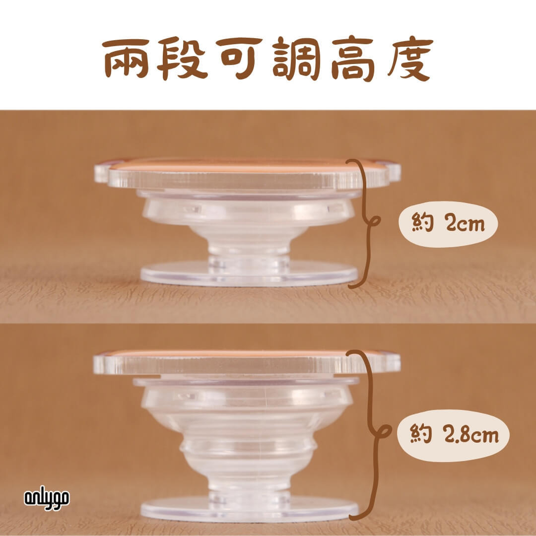 可伸縮手機氣囊支架,有兩節高度可使用。拉開一節高度約 2cm,全開高度約 2.8cm。