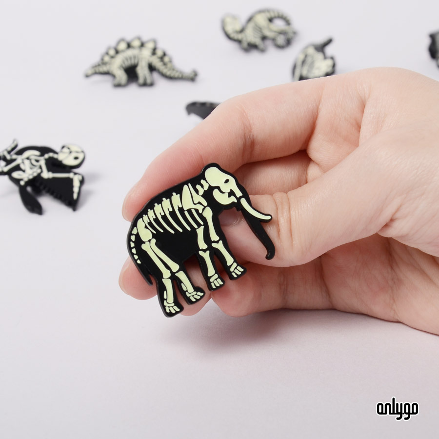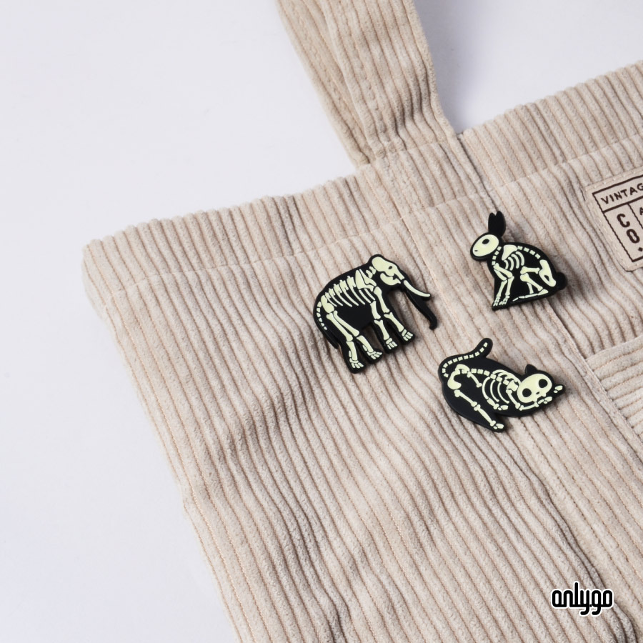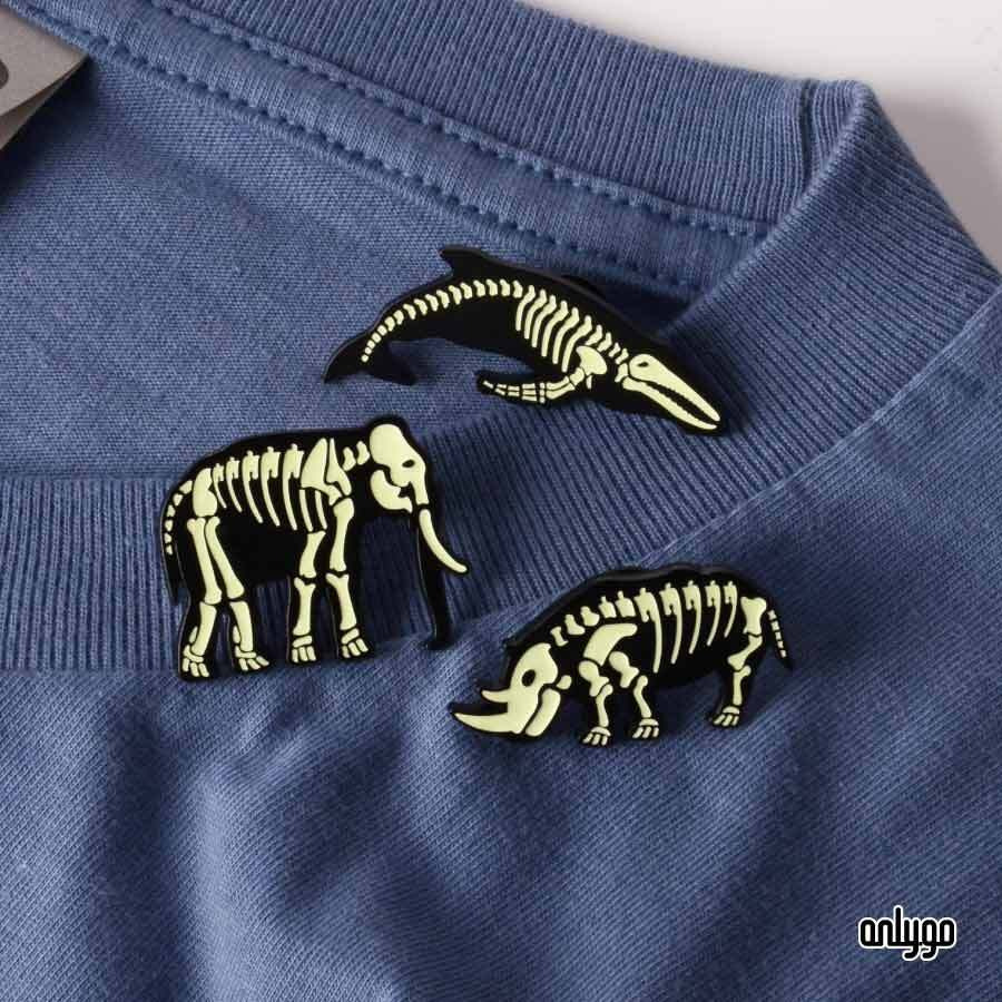 自從電影《博物館驚魂夜》上映,夜晚的博物館讓人著迷,昂里設計師以化石為出發點,結合動物骨骼與夜光效果,設計一系列富有教育性質又有趣的夜光動物徽章。