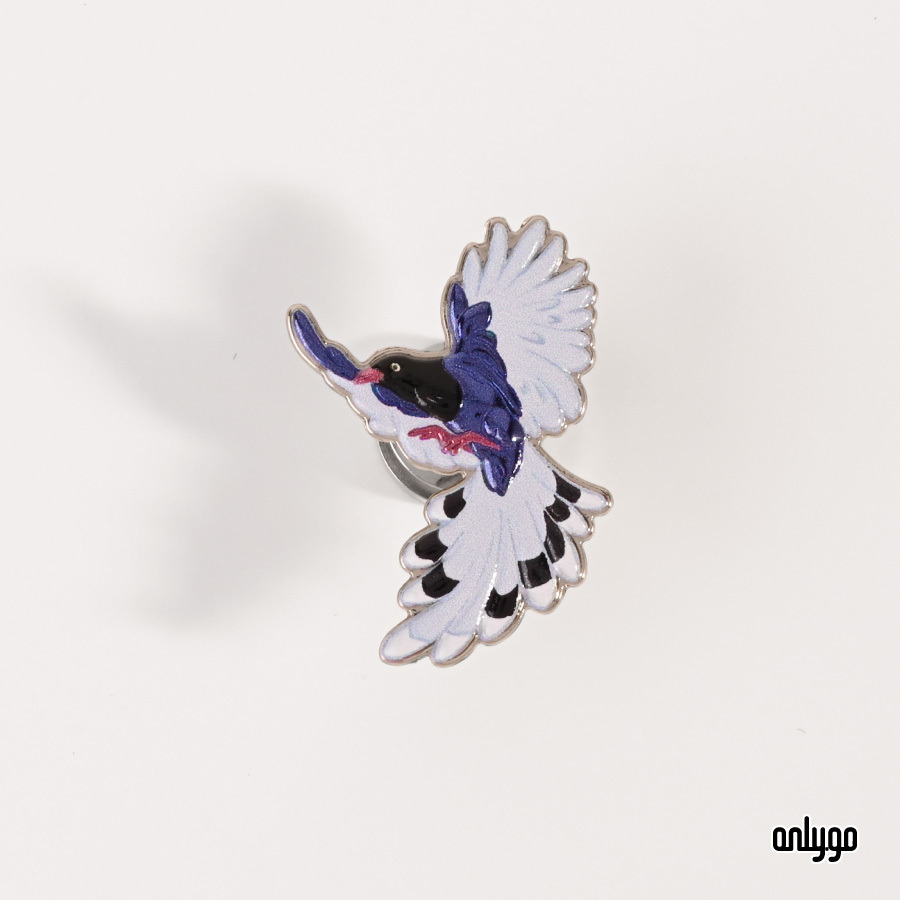 台灣藍鵲徽章,以精緻噴印技術完美呈現牠的羽毛光澤與靈動姿態,適合點綴包包、衣物,讓你隨身攜帶這份來自台灣森林的靈氣。