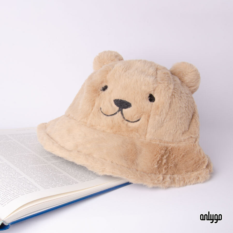 昂里熊熊絨毛漁夫帽,採用柔軟舒適的絨毛材質製成,戴起來溫暖舒適。帽子上有可愛的熊熊耳朵與療癒的表情,俏皮討喜。