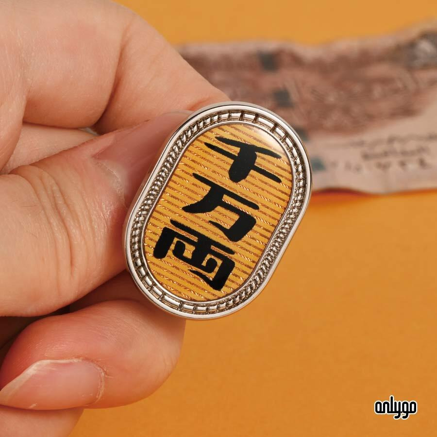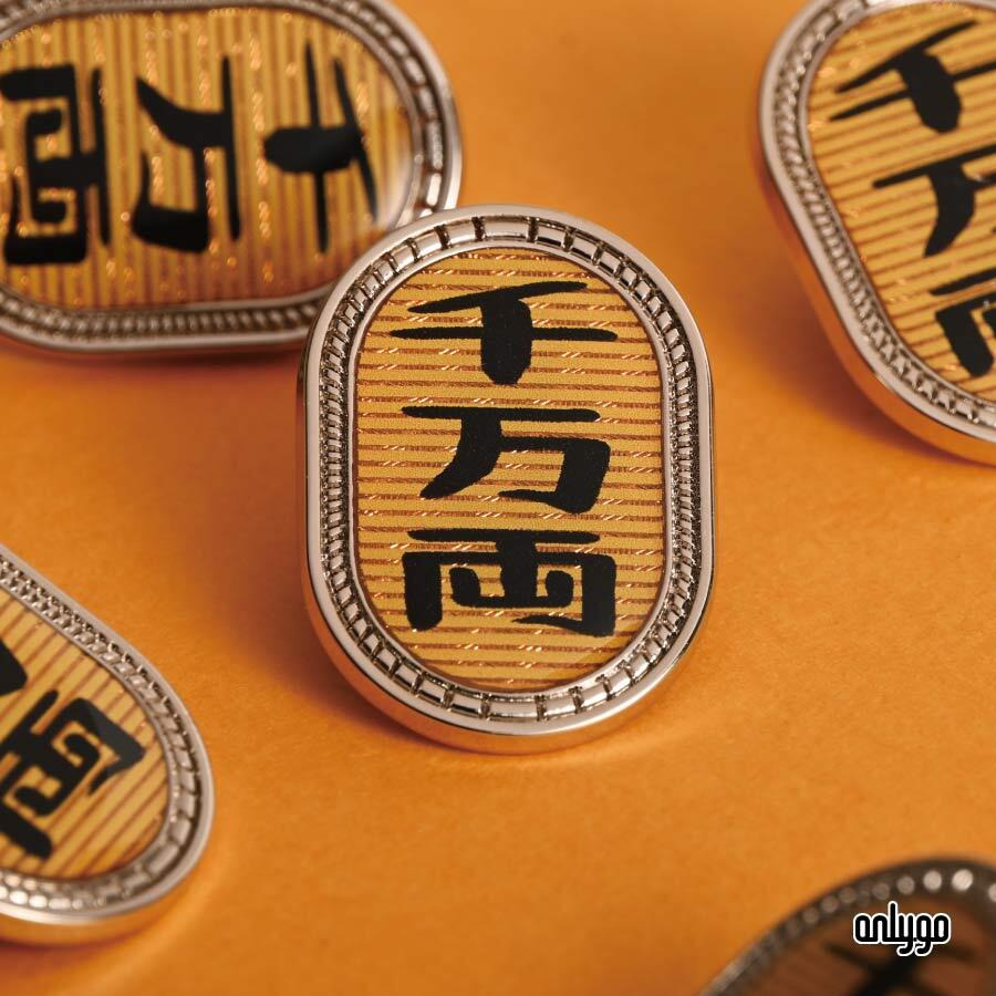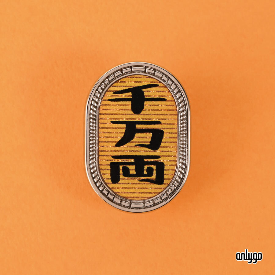 這是一款靈感取自江戶時代「小判金」造型的金屬徽章,中央大大寫著「千萬兩」三字,極具氣勢。