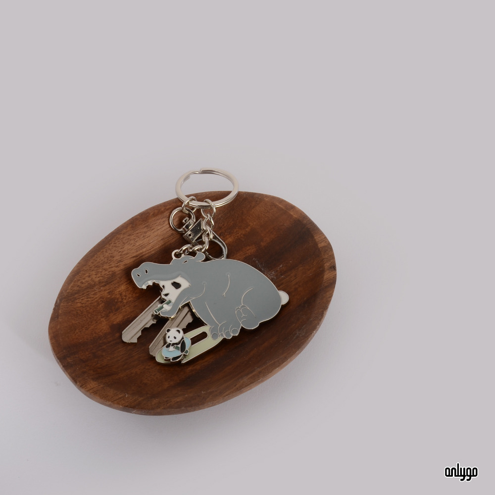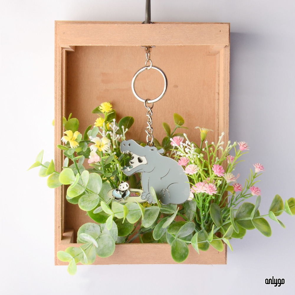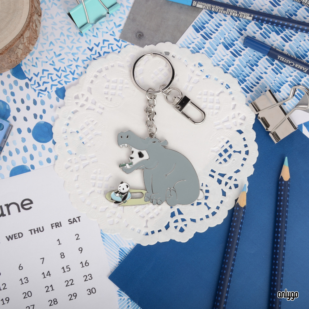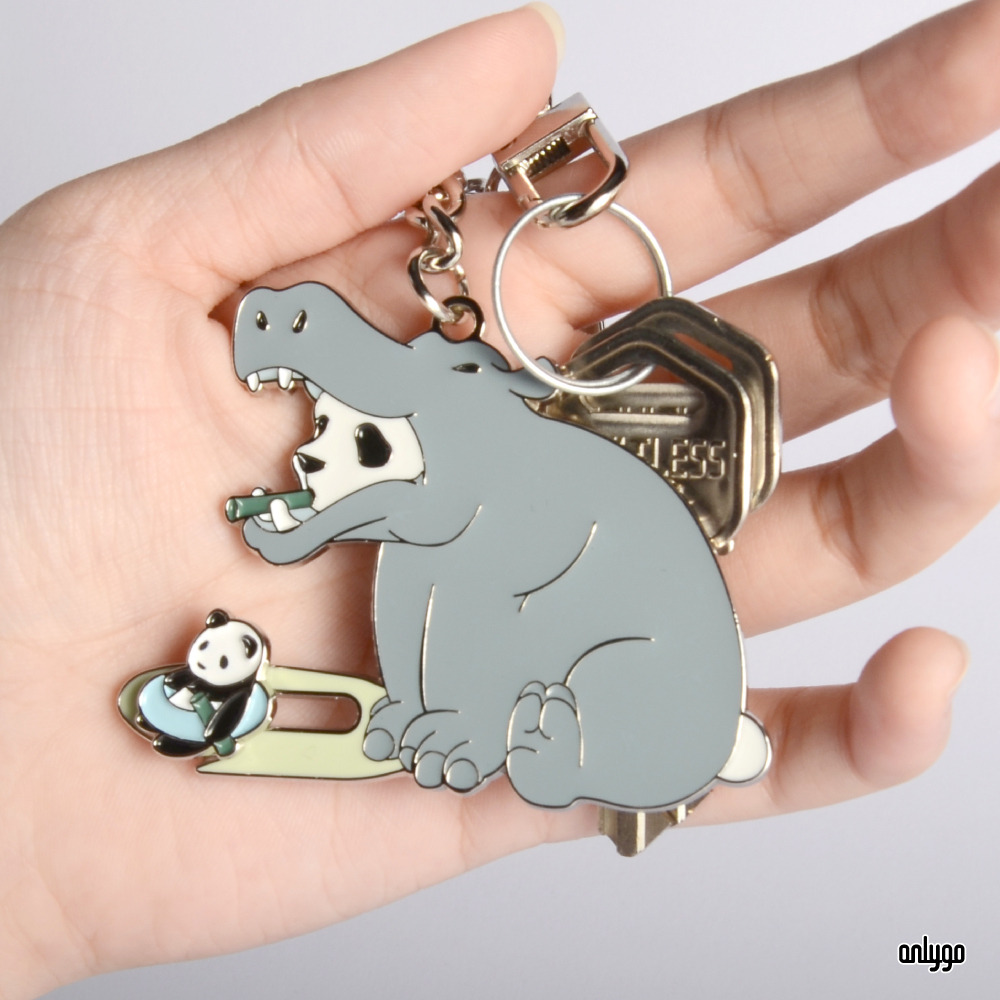 「貓熊代班系列鑰匙圈-河馬」使用凸字雕刻的方式來刻劃一排排的可愛貓熊臉,鑰匙圈主體電鍍白鎳,讓鑰匙圈整體有一致的設計感~