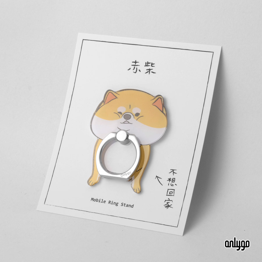 昂里設計師以不想回家的柴犬做為發想基礎,延伸出六隻不想回家的狗勾們,將他們使出渾身解數、賴皮不想回家的模樣做成手機指環,讓妳/你拉著手機指環時,就像拉著你家那隻撅脾氣不走的狗勾!