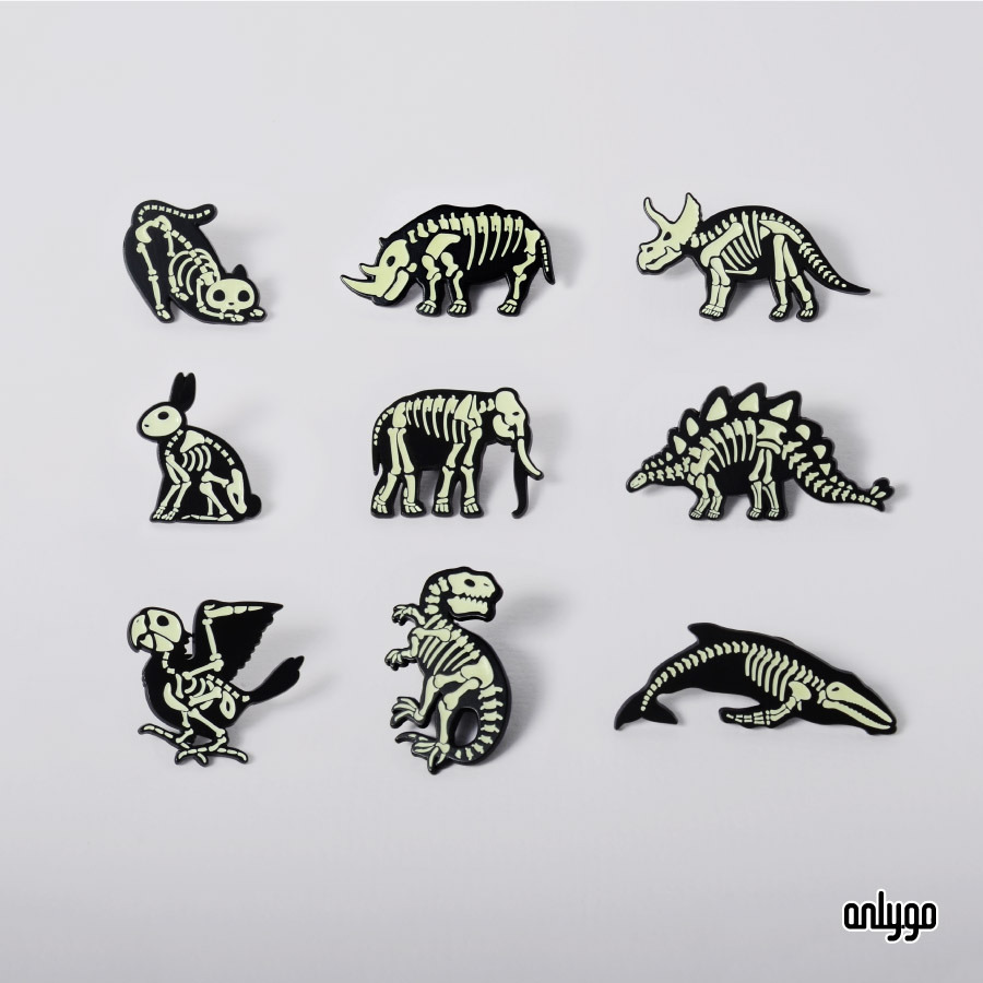自從電影《博物館驚魂夜》上映,夜晚的博物館讓人著迷,昂里設計師以化石為出發點,結合動物骨骼與夜光效果,設計一系列富有教育性質又有趣的夜光動物徽章。