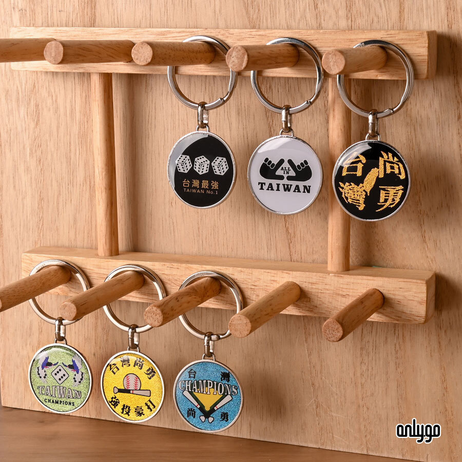 從球場應援口號「台灣尚勇」,到代表全勝精神的三顆六骰、「ALL IN」三角手勢、飛翔的藍鵲與冠軍標語,這六款鑰匙圈濃縮了台灣球迷的聲音、精神與態度。
