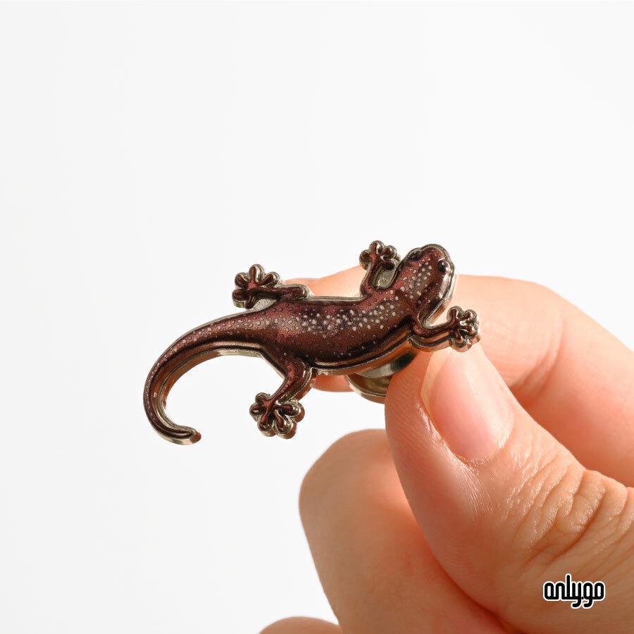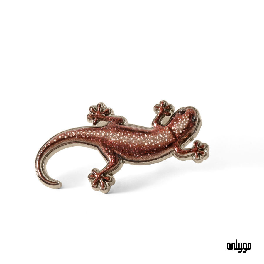 台灣山椒魚磁吸徽章以 3D 彩色噴印,精準呈現牠細長的體態、圓潤的小眼睛,以及帶有金色斑點的深色皮膚。