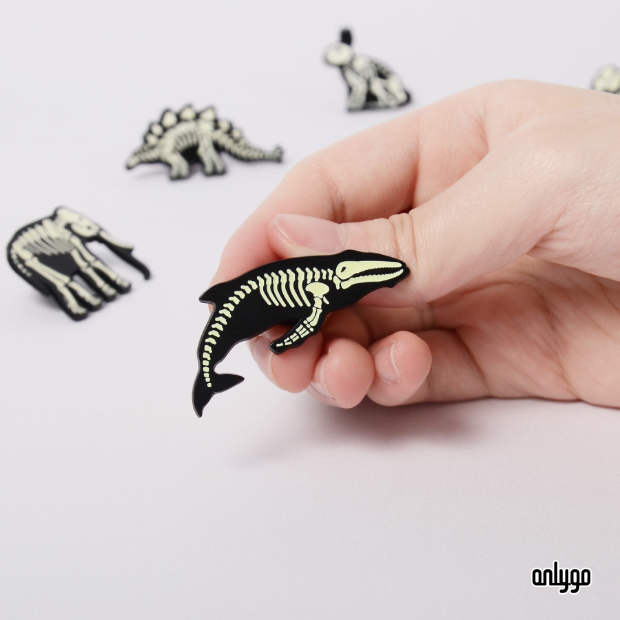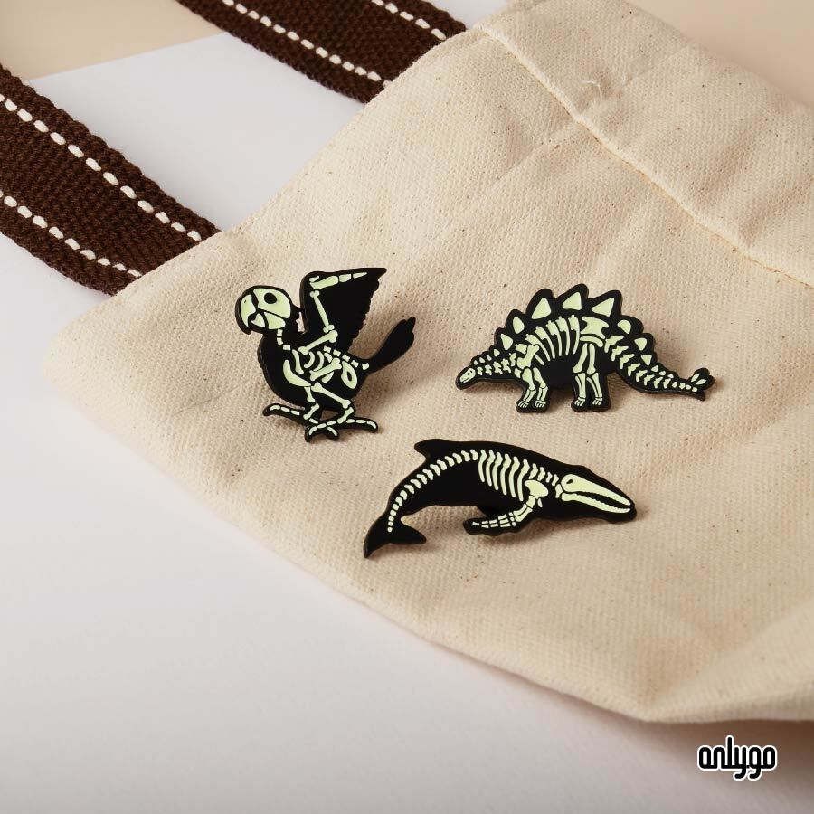 自從電影《博物館驚魂夜》上映,夜晚的博物館讓人著迷,昂里設計師以化石為出發點,結合動物骨骼與夜光效果,設計一系列富有教育性質又有趣的夜光動物徽章。